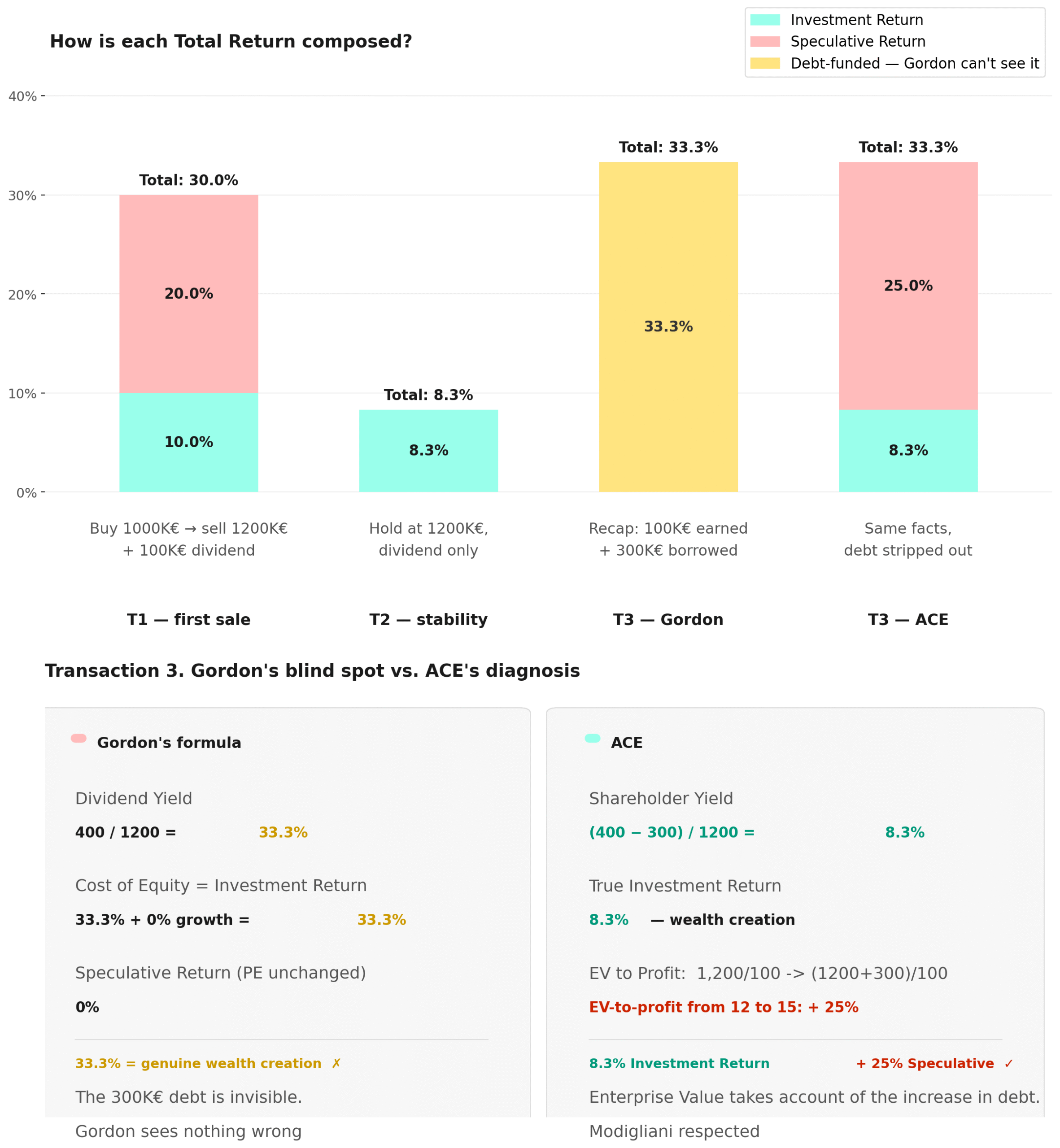 - Formula ③ in page ACE (The standard Gordon-Shapiro formula section) checks out: 33% = 33% + 0%, with zero Speculative Return